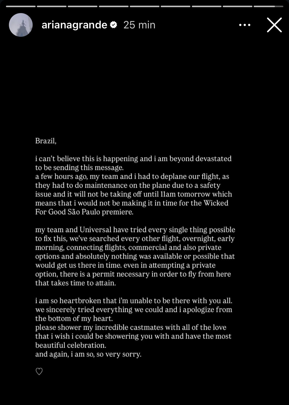“Há algumas horas, minha equipe e eu tivemos que desembarcar do nosso voo para que o avião pudesse passar por manutenção devido a problemas e ele não irá voar até 11 da manhã, o que significa que eu não chegarei a tempo para a premiere de ‘Wicked 2’ em São Paulo”, continuou.